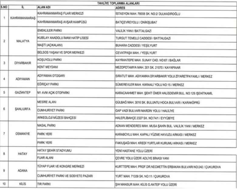 AFAD tarafından yapılan açıklamada, Kahramanmaraş'taki 7,7 ve 7,6 büyüklüğündeki depremlerin ardından oluşturulan tahliye toplanma alanları hakkında bilgi verildi. Açıklamada, 10 il içinde oluşturulan tahliye toplanma alanları listesi paylaşıldı ve depremden etkilenen vatandaşların barınma ihtiyaçlarının karşılanması amacıyla barınma alanlarına ve misafirhanelerine yerleştirilecekleri belirtildi.