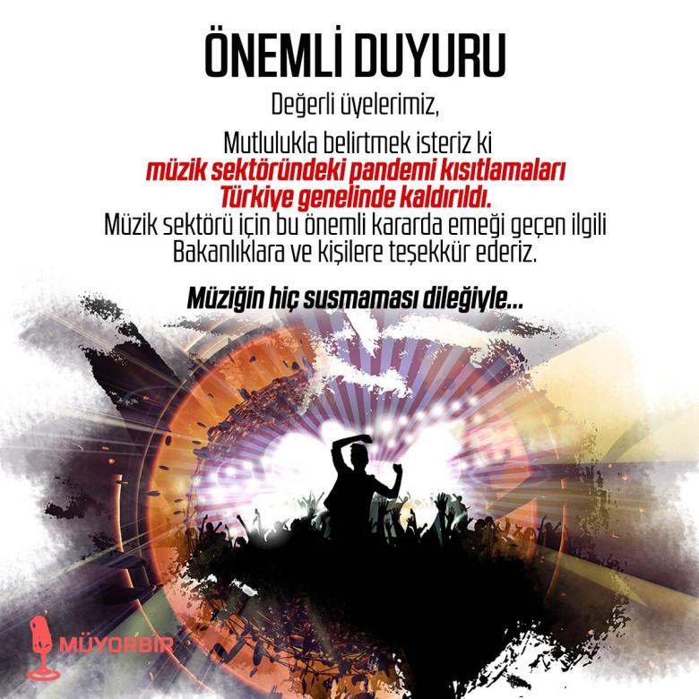 MÜYORBİR, Twitter hesabı üzerinden yaptığı duyuruda, müzik sektöründeki pandemi kısıtlamalarının Türkiye genelinde sona erdiğini memnuniyetle belirtti. Paylaşımda, "MÜJDE! Mutlulukla belirtmek isteriz ki müzik sektöründeki pandemi kısıtlamaları Türkiye genelinde kaldırıldı. Müzik sektörü için bu önemli kararda emeği geçen ilgili Bakanlıklara ve kişilere teşekkür ederiz. MÜZİĞİN HİÇ SUSMAMASI DİLEĞİYLE…" ifadelerine yer verildi.