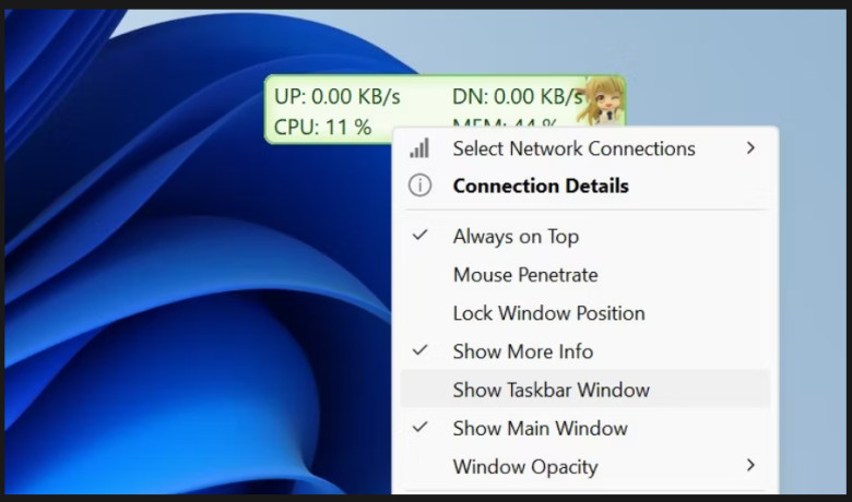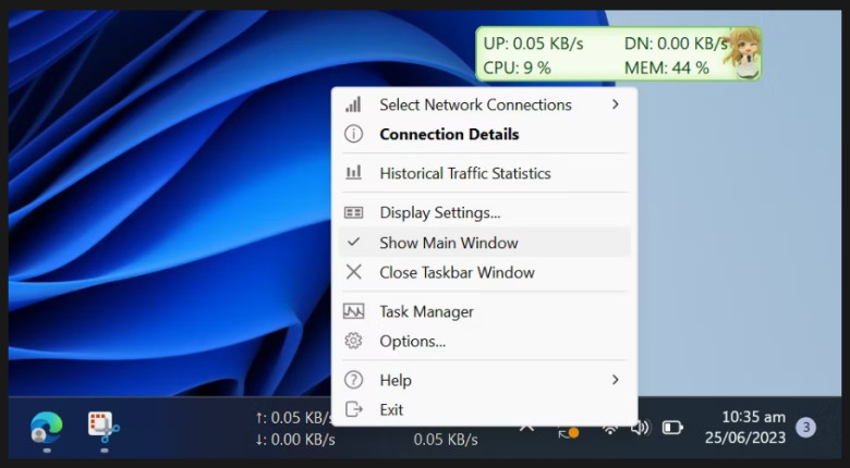 - İnternet hızı görev çubuğunda göründükten sonra, ana veya görev çubuğu penceresine sağ tıklayın ve Ana Pencereyi Göster'i işaretlemeyi kaldırın. Bu, uygulamanın ana penceresini gizler.