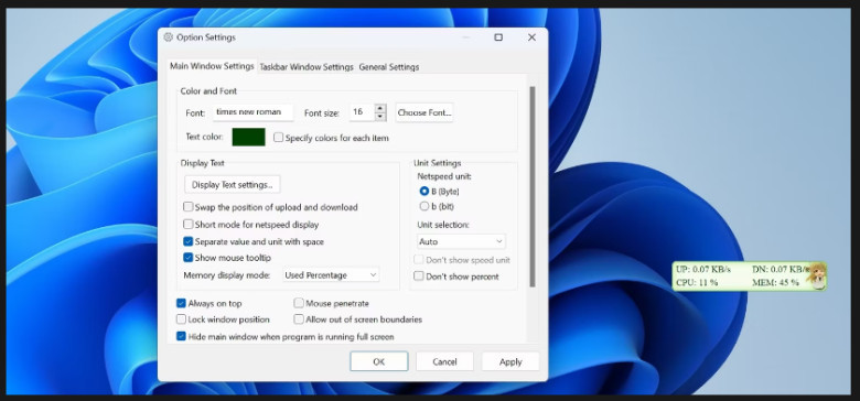 Bu şekilde, TrafficMonitor internet hızınızı görev çubuğunda gösterecektir. Uygulama size izlemek istediğiniz ağı seçme ve görüntüleme ayarlarını değiştirme imkanı da sağlar. Tercihlerinize bağlı olarak, Görüntü Ayarları penceresinden görüntüleme ayarlarını değiştirebilirsiniz.