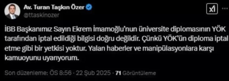 Gelişmeler üzerine Cumhuriyet Halk Partisi (CHP) cephesinden hızlı bir açıklama geldi. CHP 28. Dönem İstanbul Milletvekili Avukat Turan Taşkın Özer, sosyal medya hesabından yaptığı duyuruda, diploma iptali iddialarının gerçeği yansıtmadığını belirtti. Özer, "İBB Başkanımız Sayın Ekrem İmamoğlu’nun üniversite diplomasının YÖK tarafından iptal edildiği bilgisi doğru değildir. Çünkü YÖK’ün diploma iptal etme gibi bir yetkisi yoktur. Yalan haberler ve manipülasyonlara karşı kamuoyunu uyarıyorum." ifadelerini kullandı.